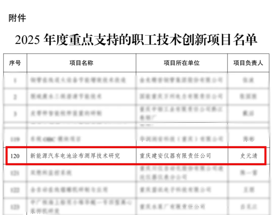 在重庆市总工会组织的2025年度优秀职工创新项目遴选中,由建安仪器史元清团队牵头负责的《新能源汽车电池涂布测厚技术研究》项目成功入选,并获得市级专项补助经费5万元。该项目聚焦产业技术自主创新,立足生产经营实际,注重一线实践与实用技术融合,具备显著的科研价值、应用前景和行业引领性,充分展现了公司职工立足岗位、攻坚克难的创新精神。下一步,建安仪器将以此为契机,持续优化创新平台,激发全员创新活力,规范使用补助资金,加速推动创新成果转化,以科技创新驱动企业核心竞争力提升。